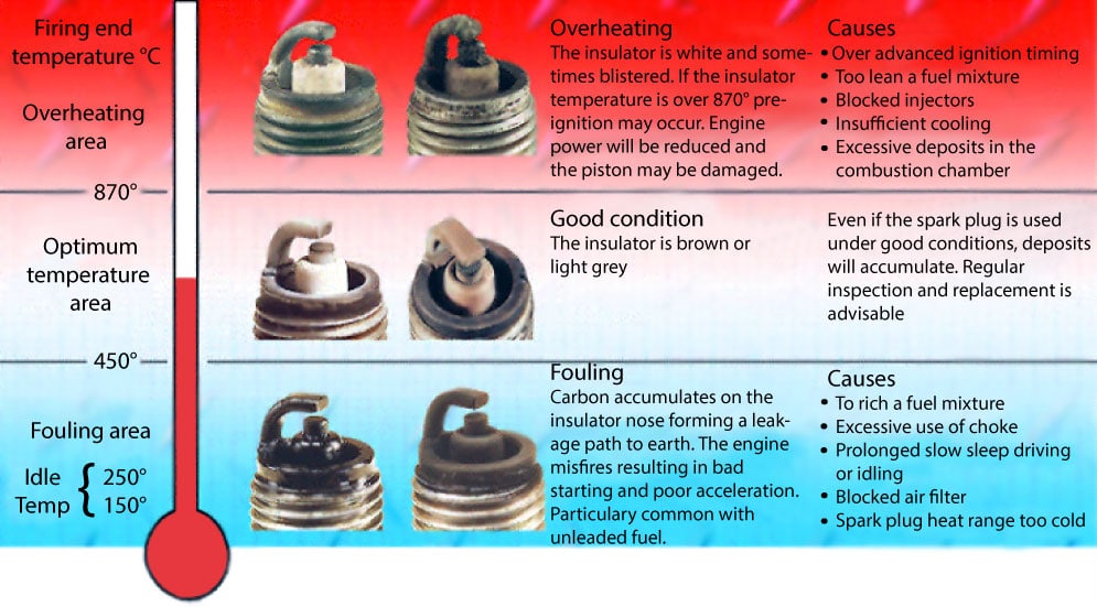 The operating temperature of a spark plug varies between 450-870°C. At 450°C the spark plug reaches its self cleaning temperature; this means that carbon deposits which are produced during combustion are actively burnt off the insulator nose. When too many carbon deposits accumulate along the insulator nose carbon fouling occurs and engine misfire may occur. If the temperature of a spark plug exceeds 870°C overheating may occur leading to spark plug and possible engine damage.