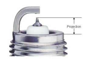 The projection of a spark plug is measured as the distance from the end of the metal shell to the tip of the